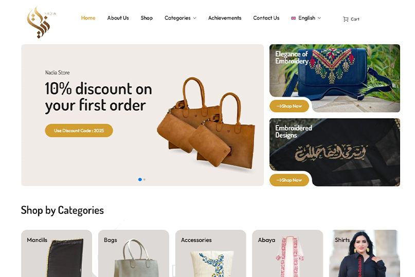 Mandil Nadia is an elegant e-commerce platform that showcases the unique handmade creations of designer Nadia Mandil. The website highlights a curated collection of embroidered bags, scarves, shirts, home accessories, and decorative pieces, each reflecting a fusion of traditional craftsmanship and modern aesthetics. Designed to be both artistic and user-friendly, the platform allows visitors to explore product details, view collections, and make purchases directly online. With its clean visuals, soft color palette, and refined layout, the website reflects Nadia’s creative identity and her commitment to celebrating authentic, handcrafted design.